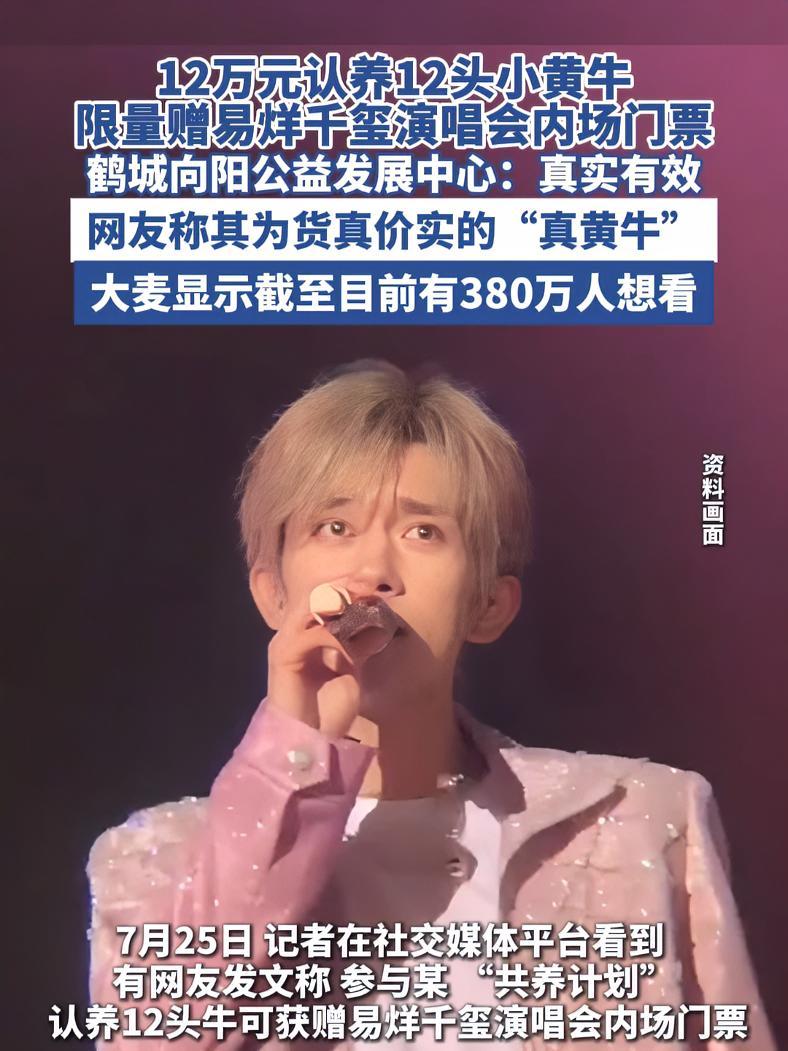 2025年7月24日,易烊千玺2025演唱会「礐嶨」上海站门票在开售仅11秒后便被抢购一空,340万“想看”人数与380万抢票者的激烈竞争,让这场演唱会成为今夏最炙手可热的文化事件。然而,在官方售票渠道之外,一场别开生面的“黄牛票”风波正悄然掀起——湖南省怀化市鹤城区向阳公益发展中心推出的“共养计划”,以“12万元认养12头小黄牛赠内场门票”的模式,成为舆论焦点。